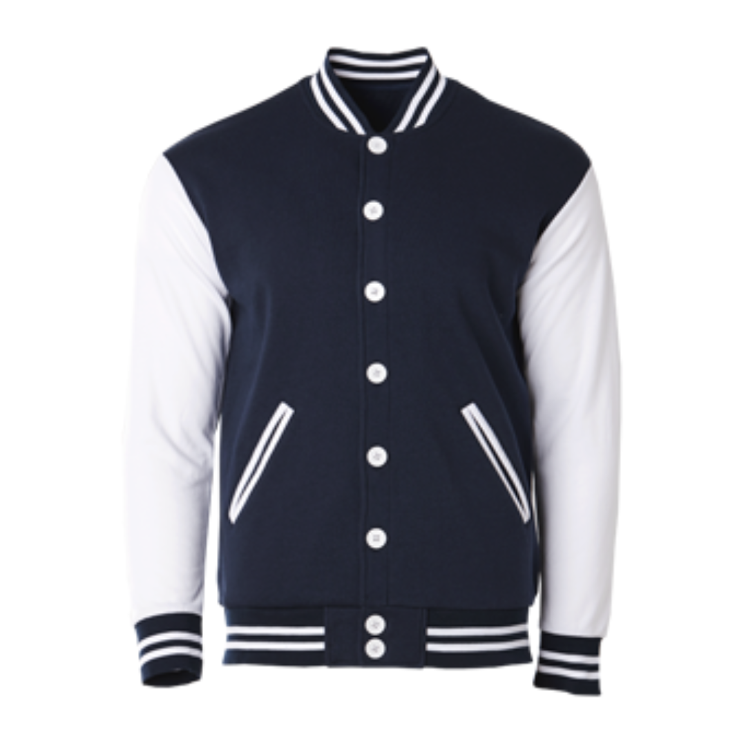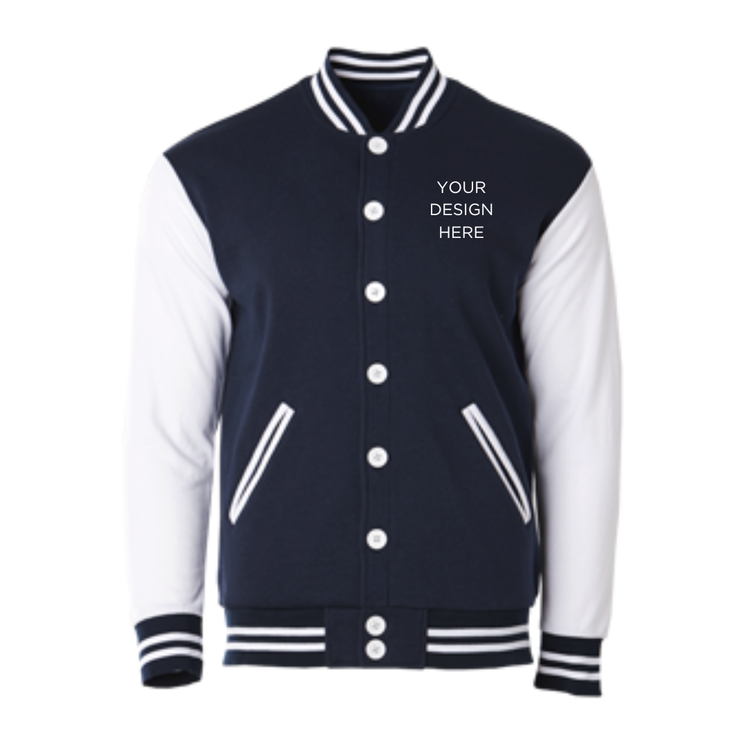 Classic varsity jacket CRJ1100 suitable for corporate teams, events, and branded merchandise. Made from cotton-poly CVC fleece with an oversized straight-cut fit.