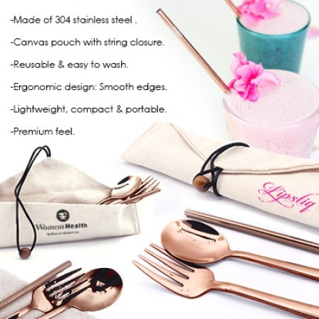 Dine sustainably in style. The AURA Set includes premium rose gold stainless steel cutlery and a reusable straw, all packed in a convenient canvas pouch. Lightweight, portable, and designed with smooth ergonomic edges, it’s perfect for travel, office lunches, or eco-friendly gifting.