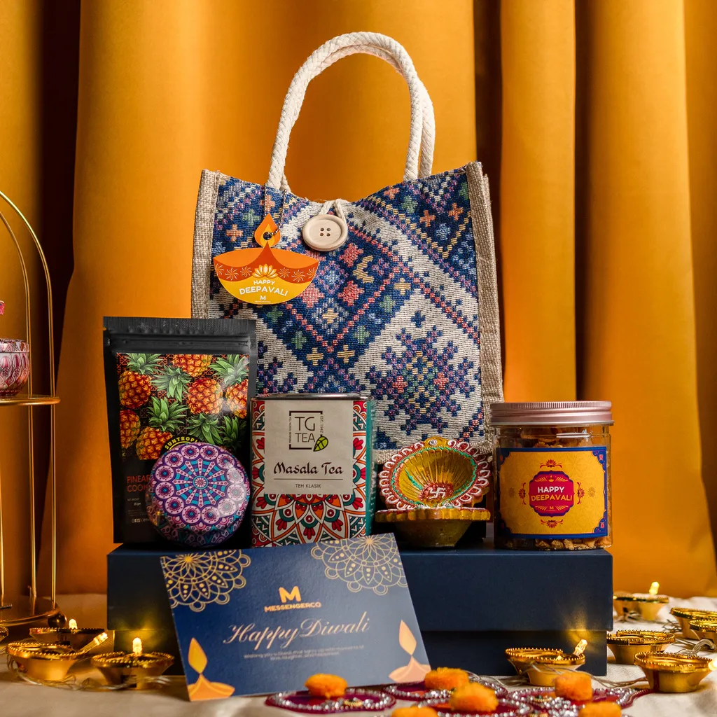 8. Gift Tag (Custom Die Cut Shape) - Festive gift tag with vibrant Deepavali design and hanging chain, completing the elegant presentation.