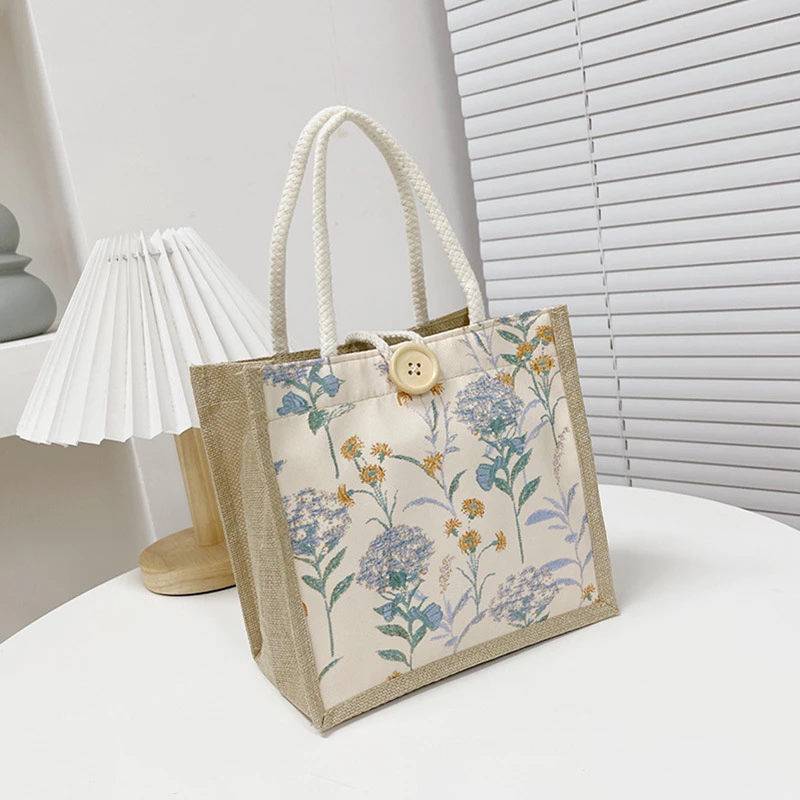 A compact jute and canvas tote bag with floral design, suitable for gifting and daily use.